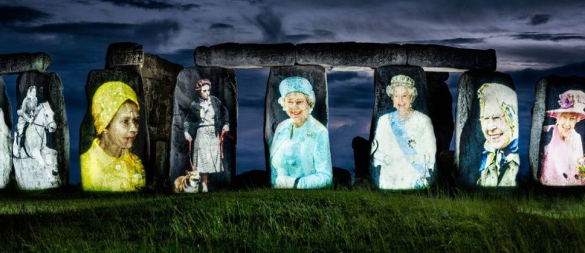 Ocho imágenes de la monarca aparecieron sobre las célebres piedras rectangulares ubicadas en Wiltshire para marcar cada década de su reinado.