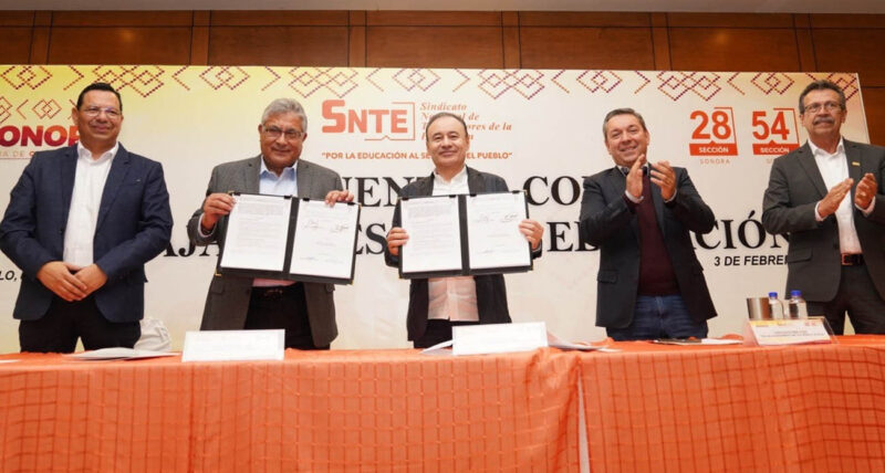 En compañía del secretario general del sindicato, Alfonso Zepeda Salas; el titular de Educación y Cultura, Aarón Grageda Bustamante; así como de César Adalberto Salazar López y Jesús Javier Ceballos Corral, líderes de las secciones 28 y 54 del SNTE en Sonora, respectivamente, el mandatario firmó el documento para reactivar este apoyo para personal docente, mismo que contaba con más de siete años en el abandono.