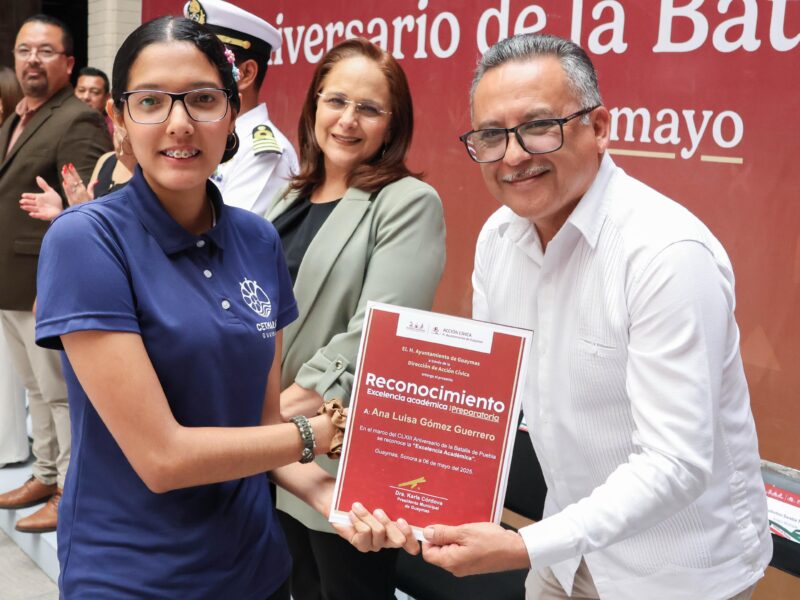 Guaymas, Sonora, 06 de mayo de 2025.- En el marco de la conmemoración del CLXIII Aniversario de la Batalla de Puebla, el Ayuntamiento de Guaymas a través de la Dirección de Acción Cívica realizó la ceremonia de entrega de reconocimientos de Excelencia académica a estudiantes de nivel preparatoria por su responsabilidad, esfuerzo y dedicación al estudio.