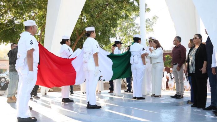 Guaymas, Sonora.- Para conmemorar el Día de la Bandera, símbolo de orgullo e identidad nacional, el Ayuntamiento de Guaymas a través de Acción Cívica, llevó a cabo una ceremonia cívica en la que se contó con la presencia de autoridades navales, municipales y educativas.