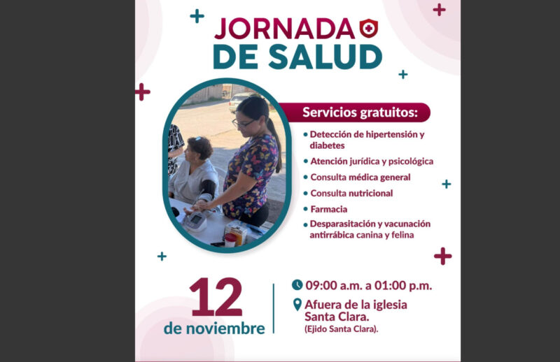 En coordinación con el Ayuntamiento de Guaymas, Desarrollo Social, la Coordinación de Atención a la Mujer y Salud Pública Municipal se instalará este 12 de noviembre módulo de atención en el ejido Santa Clara (afuera de la iglesia Santa Clara) a partir de las 9:00 de la mañana hasta las 13:00 horas.