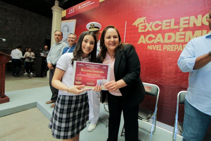 De manera simbólica Andrea Paulina Escobar Chávez, del COBACH Plantel “José María Maytorena Tapia” y Silvana Galindo Mena, del Bachillerato Anáhuac Cervino, recibieron un cheque a nombre de los jóvenes estudiantes reconocidos por su dedicación, esfuerzo y compromiso, por ello, el Ayuntamiento de Guaymas entregó cheque a cada uno de los estudiantes que obtuvieron “Excelencia Académica”.