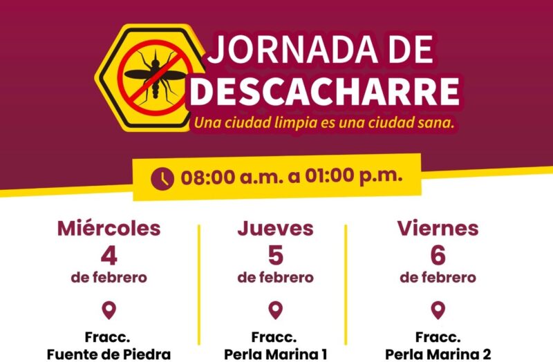 Guaymas, Sonora, 3 de febrero de 2026.- Del 4 al 6 de febrero habrá Jornada de descacharre en las colonias Fuente de Piedra y Perla Marina 1 y 2, promovida por el Ayuntamiento de Guaymas para trabajar en la limpieza de patios y en la prevención del dengue, zika y chikungunya.