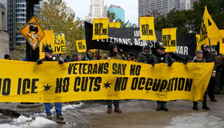 Otro veterano de los Marines narró a los 200 participantes en la protesta que “son las mismas fuerzas que ocuparon a Irak y Afganistán las que ahora ocupan ciudades estadunidenses… En este día de veteranos yo no me pongo de pie con la bandera nacional, yo me pongo de pie con el pueblo”.