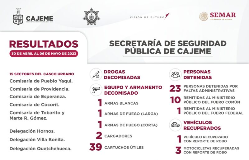 Las acciones de la Secretaría de Seguridad Pública en Cajeme dieron como resultado un total de 34 personas detenidas por elementos de la Policía Municipal en coordinación con la Secretaría de Marina y las diversas corporaciones, de los cuales 23 fueron por faltas administrativas, 10 se turnaron al Ministerio Público del Fuero Común y uno al Fuero Federal.