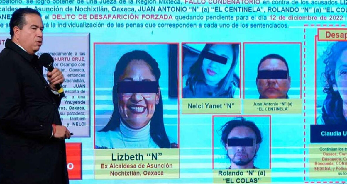 Ayer, 7 de diciembre, la Fiscalía de Oaxaca informó que, tras desahogar las pruebas ofrecidas, se logró obtener el fallo condenatorio en contra de los acusados: Lizbeth ‘N’, exalcaldesa de Nochixtlán, Oaxaca; Juan Antonio ‘N’, alias ‘El Centinela’; Rolando ‘N’, alias ‘El Colas’; y Nelci Yanet ‘N’, por el delito de desaparición forzada.