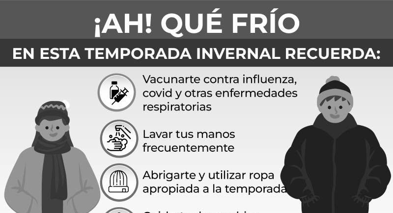 Algunas de las medidas de prevención que la SSA emite son: vacunarse contra enfermedades respiratorias, como influenza y covid-19; en caso de tener que salir de casa, hay que abrigarse bien, utilizando ropa térmica, chamarra gruesa, y de ser necesario, gorro, guantes y cubreboca.