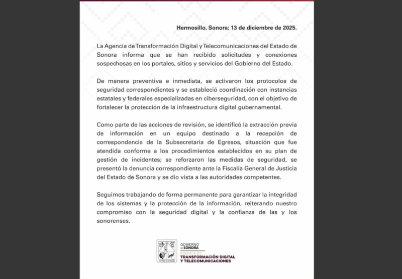 El Gobierno del Estado Informa a la ciudadanía que se activaron de manera preventiva los protocolos de seguridad digital ante actividad sospechosa en servicios del Gobierno del Estado !!!