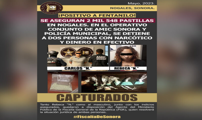 Nogales, Sonora, mayo 19 de 2023.- En acciones de combate contra el fentanilo, agentes de la AMIC, en conjunto con la Policía Municipal de Nogales, aseguraron 2 mil 548 pastillas del opioide en dos acciones, donde se detuvieron a dos personas en flagrancia delictiva.