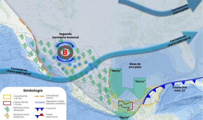 Para hoy, los efectos de la segunda tormenta invernal y su masa de aire fría generarán un ambiente de gélido a muy frío sobre la región montañosa de Sonora con temperaturas mínimas desde los -10°C a los 0°C. A su vez, en combinación con una *vaguada en altura* y la *corriente en chorro subtropical* ocasionarán rachas de viento fuertes (+75 km/) sobre toda la línea costera del estado, así como la región montañosa del este. Por su parte, mantiene la probabilidad de *lluvias ligeras a moderadas* con posible caída de aguanieve y nieve sobre el municipio de Yécora y su zona montañosa.