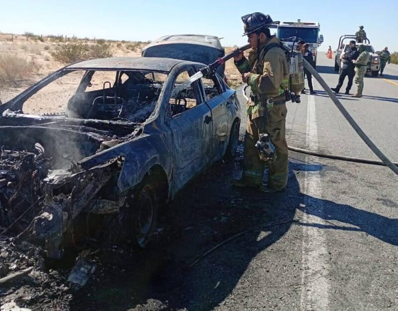 Bomberos voluntarios Atendiendo incendio de un vehículo carretera San Luis sonoyta km 165 , al lugar llegó la unidad 68 desafortunadamente y debido ala distancia el vehículo fue perdidas total