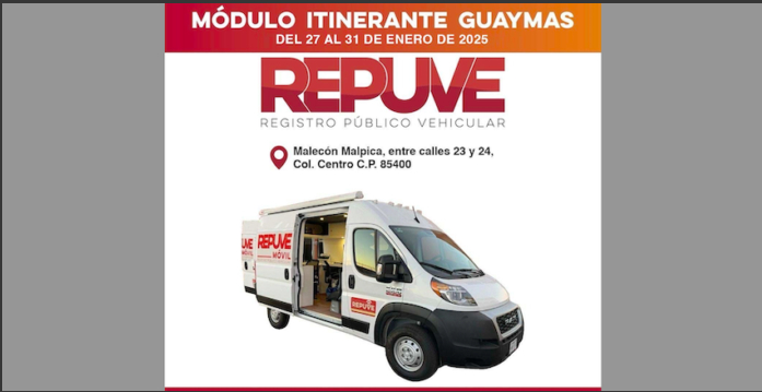 ¡Atención! Del 27 al 31 de enero en el Malecón Turístico se instalará la oficina móvil de REPUVE para propietarios de vehículos usados de procedencia extranjera. El horario de atención será desde las 8:00 de la mañana hasta las 15:00 horas, consulta la documentación requerida a través de la página http://www.repuvesonora.gob.mx