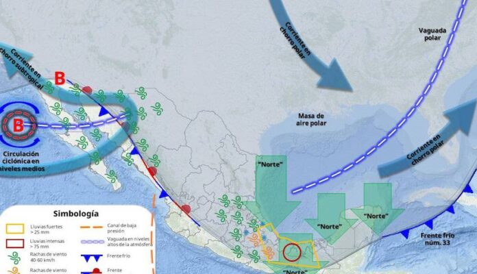 Para hoy, la corriente en chorro subtropical en combinación con una circulación ciclónica en niveles medios y altos originará cielos parcialmente nublados con probabilidad de lluvias aisladas sobre el norte, noroeste, centro y este; a su vez, rachas de viento fuertes (40 a 60 km/h) sobre la región norte y oriente de Sonora.