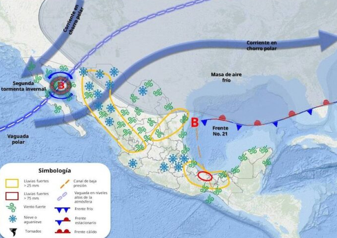 Durante hoy la *segunda tormenta invernal* continuará su desplazamiento sobre el territorio Sonorense y en combinación con la corriente en chorro polar propiciarán lluvias moderadas, caída de nieve y aguanieve, vientos fuertes sobre gran parte de Sonora, así como un marcado descenso de temperatura con un ambiente gélido con heladas durante la madrugada y noche con temperaturas mínimas desde los -12°C a -3°C en regiones altas montañosas del norte y oriente, de -6°C a 0°C sobre el norte; de 4°C a 9°C sobre el centro y noroeste; de 5°C a 10°C sobre el sur del estado. Por su parte, las rachas de viento de 40 a 60 km/h sobre el norte y oriente del estado.