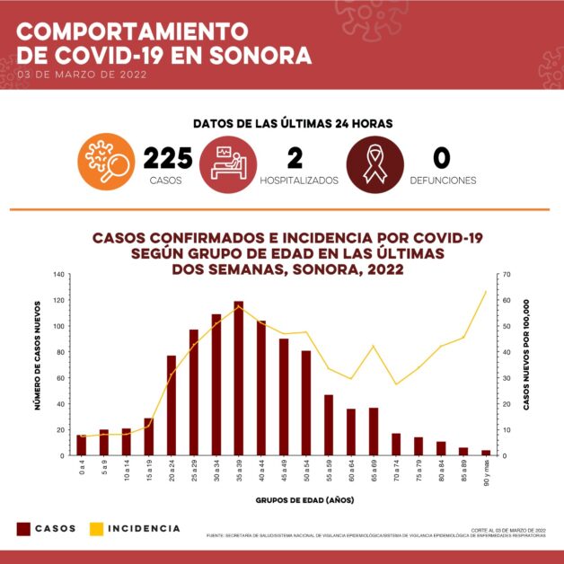 Hermosillo, Sonora- La Secretaría de Salud (SSA) confirmó 225 nuevos casos y cero defunciones por Covid-19.