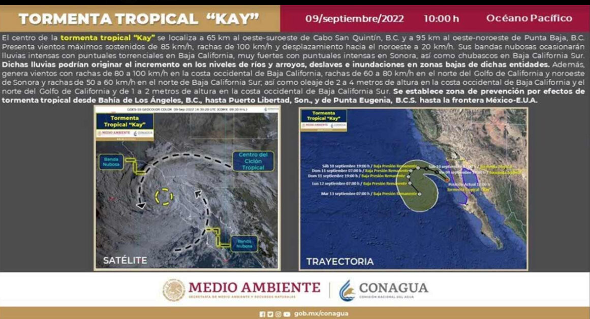 La ahora tormenta tropical ‘Kay’ se ubica a 65 kilómetros al oeste-suroeste de Cabo San Quintín y a 95 kilómetros al oeste-noroeste de Punta Baja, Baja California, con movimiento paralelo a la costa rumbo al noroeste a 20 kilómetros por hora, informó el Servicio Meteorológico Nacional (SMN).