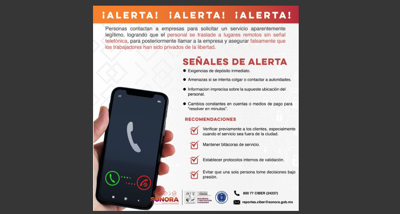 La Secretaría de Seguridad y Protección Ciudadana (SSPC) Sonora, a través de la Unidad Cibernética, emite una alerta preventiva dirigida a empresas y prestadores de servicios ante una modalidad de extorsión telefónica que se realiza mediante supuestas contrataciones falsas, principalmente en zonas rurales o con baja conectividad.
