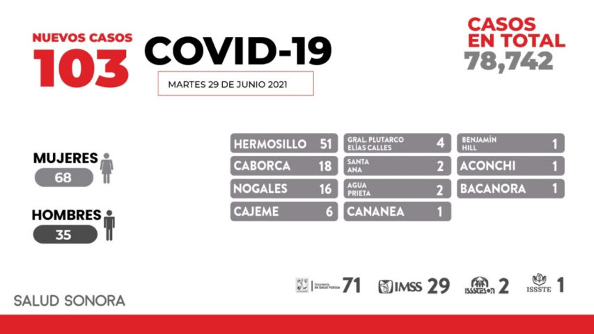 También se confirmaron 103 nuevos casos por COVID, en 68 mujeres y 35 hombres; acumulándose 78 mil 742 casos en total. Los nuevos casos son residentes de: Hermosillo 51; Caborca 18; Nogales 16; Cajeme seis; General Plutarco Elías Calles cuatro; Santa Ana y Agua Prieta dos cada uno; Cananea, Benjamín Hill, Aconchi y Bacanora uno cada uno.